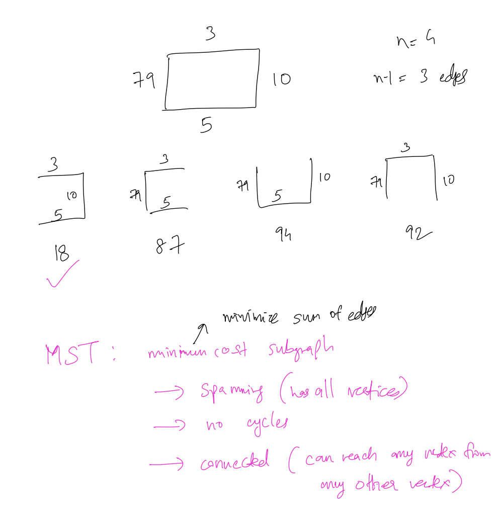 - tree: is undirected graph, then is a subgraph if and , then is spanning if i.e., contains all vertices of .