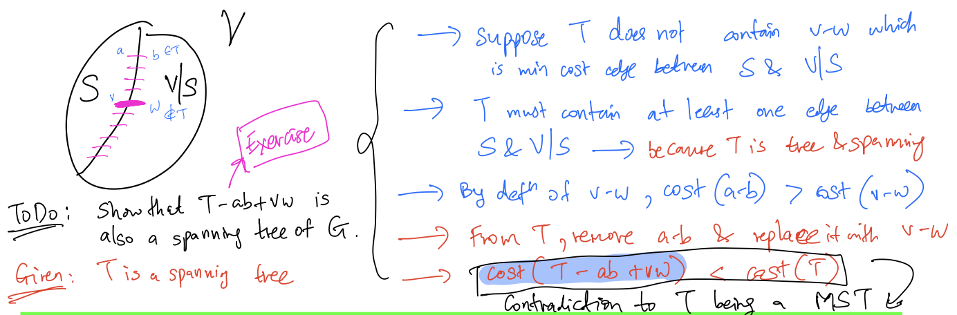 - And replacing with gives a spanning tree of smaller cost. Contradiction