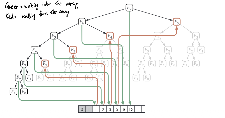 Trimming the recursive tree to compute via memoization. Downward green arrows indicate writing into the memoization array & upward red arrows indicated reading from the memoization array.
