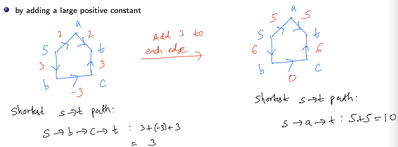 Adding a large positive constant to all edge-lengths can change identity of shortest paths from