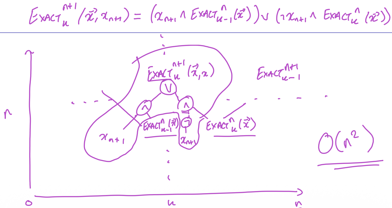 EXACTkn(x1)=⎩⎨⎧¬x1k=0x1k=1x1∧¬x1 otherwiseEXACTkn+1(x,xn1)=(xn+1∧EXACTk−1n(x)∨¬xn+1∧EXACTkn(x))
