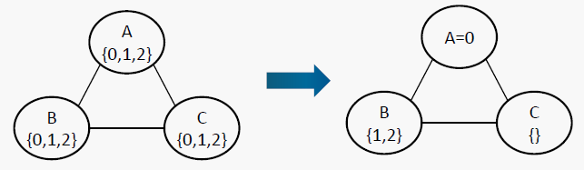 When A is assigned 0, domains of its neighbours B and C are reduced, so it is quick to know this assignment is not legal (as C is empty now).