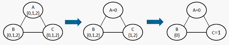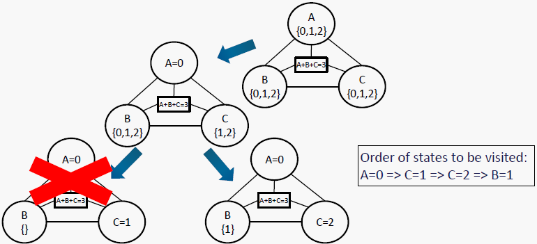 Example : Example: There are three variables A, B and C, all with domain . The constraint is . Tie is broken alphabetically and numerically.