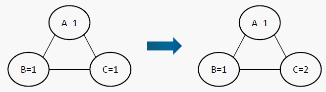Let us say the randomly generated initial assignment is (A=1, B=1, C=1). When a solution not found or stop criterion not met, do: