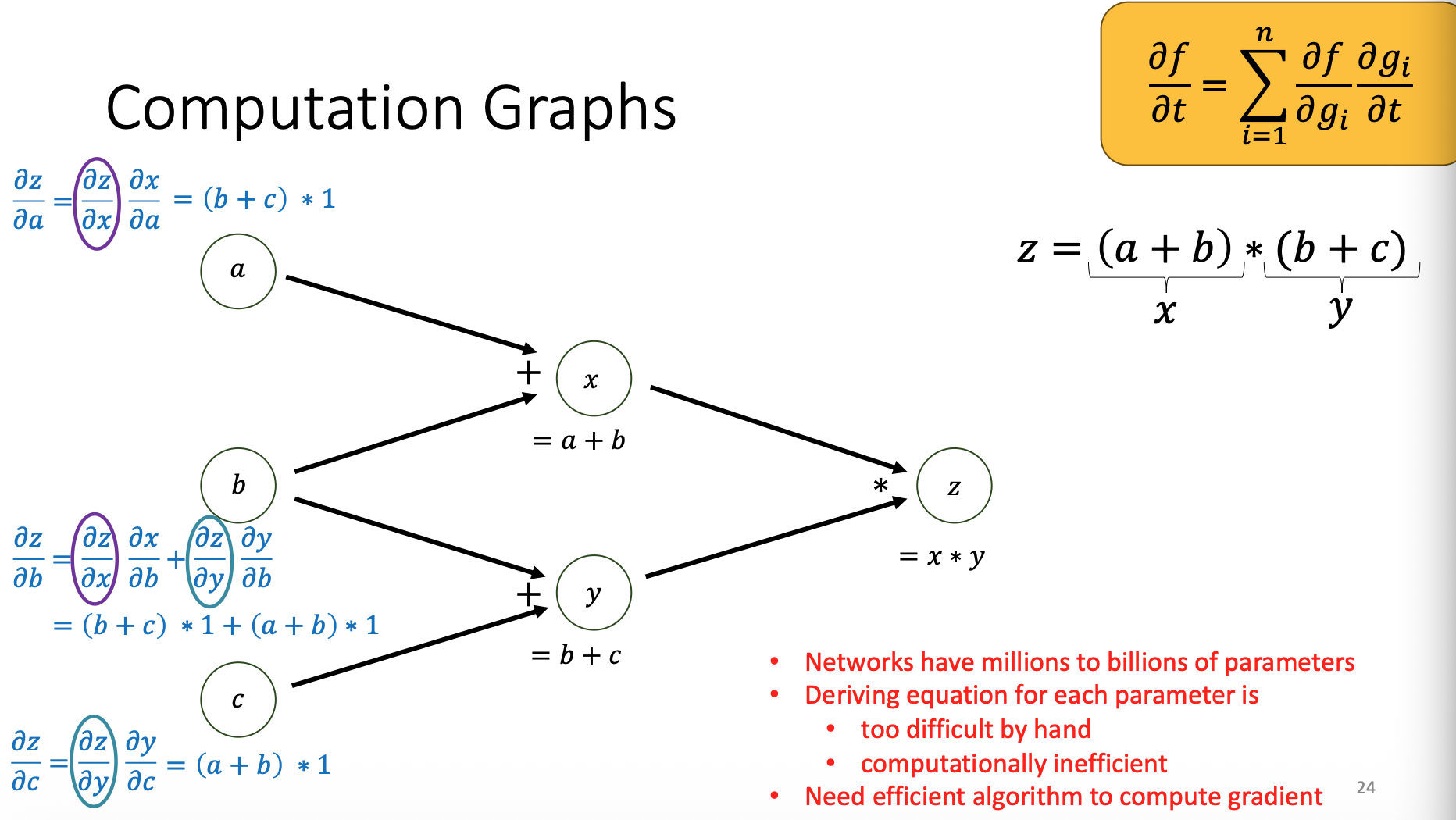 When an output is influenced by multiple paths (multiple successors), the derivatives must be summed: