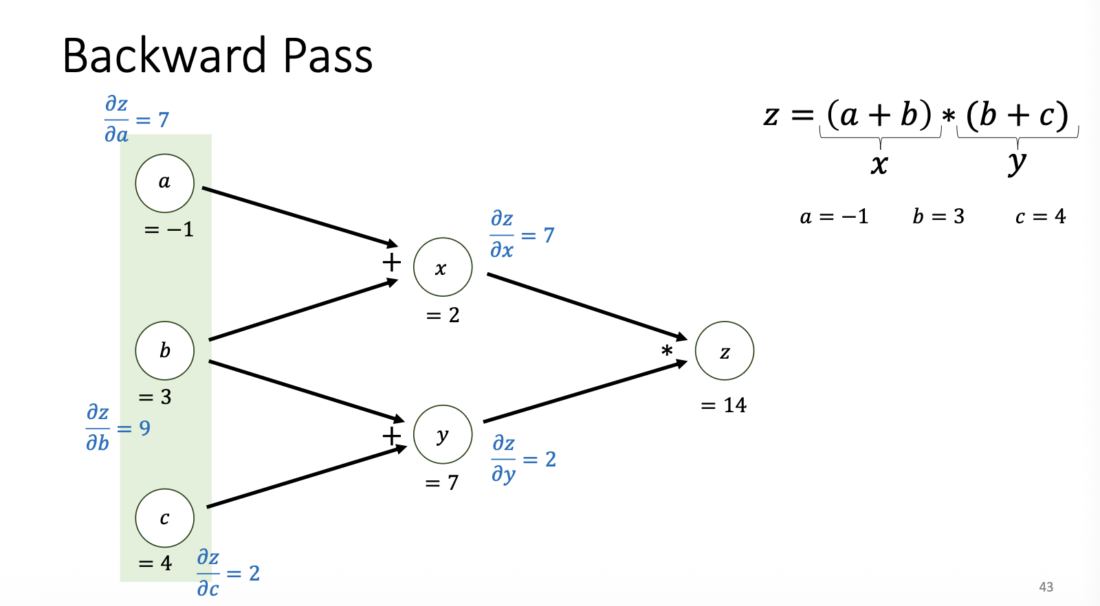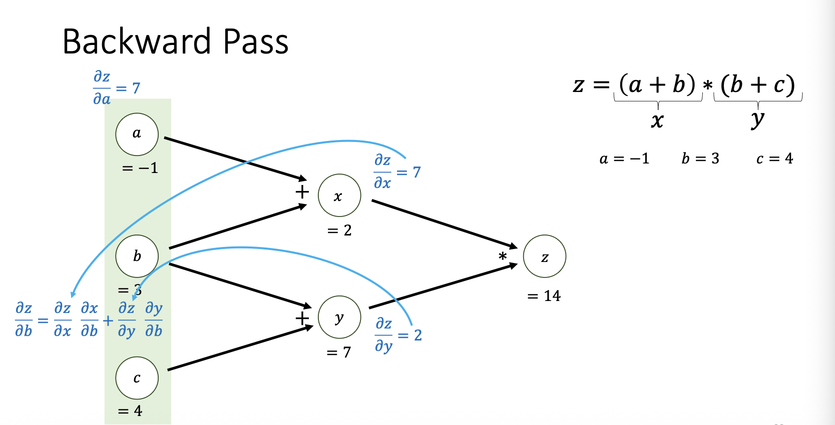 - Backward Pass: Move backward through the graph to compute gradients (partial derivatives) for every parameter, using from successor nodes.