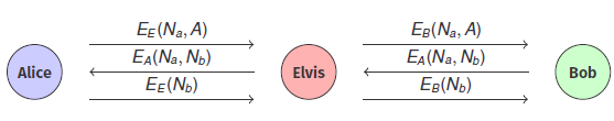 - Alice now sends to Elvis, so Elvis now has Bobβs nonce AND forwards it to B to complete the protocol.