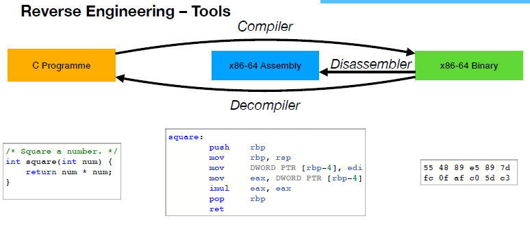 - Decompiler : A programme used to translate machine code into a high-level programming language (e.g., C code).
